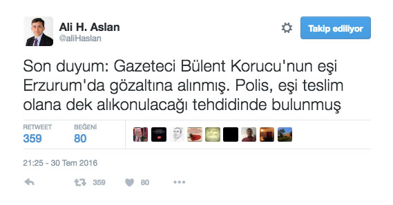 Aslan, başka bir Twitter paylaşımında de ise eski Zaman Gazetesi Yöneticisi Bülent Korucu’nun eşinin gözaltına alındığını ve Korucu teslim oluncaya kadar bırakılmayacağının söylendiğini iddia etti.