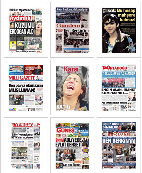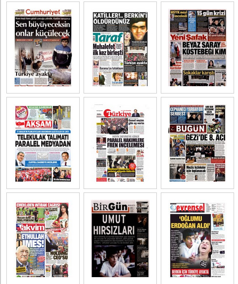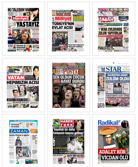 Gezi protestoları sırasında ekmek almaya giderken polisin attığı gaz fişeği ile başından vurulan 14 yaşındaki Berkin Elvan’ın 268 gün sonra gerçekleşen ölümü Türkiye’nin gündemini sarstı. Başta İstanbul olmak üzere bir çok kentte protesto gösterileri düzenlenirken, gazeteler de manşetlerini Berkin’in ölümüne ayırdı. Radikal gazetesi  kapak fotoğrafında “Adalet Kör, vicdan ölü” başlığını kullandı.  Sabah, Yeni Şafak, Star, Akşam, Türkiye ve Takvim gibi hükümete yakın gazeteler Berkin Elvan’ın ölüm haberini  manşet yapmadı ve ana sayfalarında küçük haber olarak değerlendirdi.