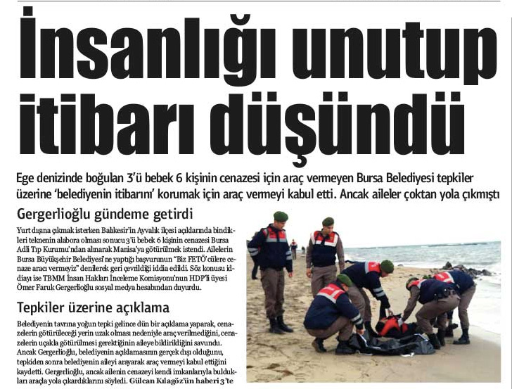 Yeni Yaşam gazetesi de Bursa Belediyesi'nin Ege Denizi'nde ölen 3'ü bebek 6 kişinin cenazesi için araç vermemesini "İnsanlığı unutup itibarı düşündü" başlığı ile manşetine taşıdı. Haberde, cenazeleri Bursa'dan Manisa'ya götürmek isteyen aileye önce araç vermeyi reddeden belediyenin gelen tepkilerler üzerine araç vermeyi kabul ettiğinde ailelerin yola çıkmış olduğu belirtildi.