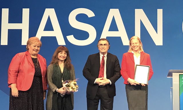 Norwegian Prime Minister Erna Solberg (left) and jury chair Professor Janne Haaland Matlary (right) are seen together with Hasan Cemal and Yasemin Çongar.