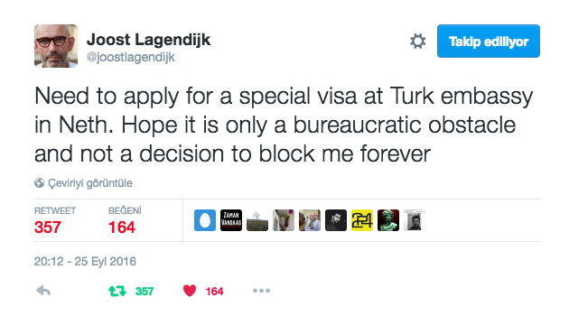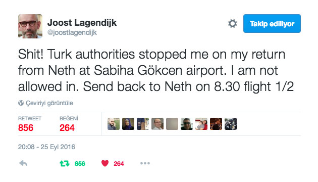 25 Eylül tarihinde Türkiye’ye dönüş yapan eski Zaman gazetesi yazarı ve Türkiye-AB Karma Parlamento Komisyonu eski eş başkanı Joost Lagendijk’ın Türkiye’ye girişine izin verilmedi. Lagendijk, gelişmeyle ilgili bilgi verdiği tweet’lerinde Hollanda’ya dönüp “özel” bir vize alması halinde dönebileceğinin söylendiğini yazdı.