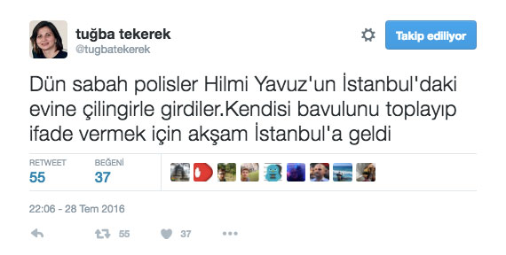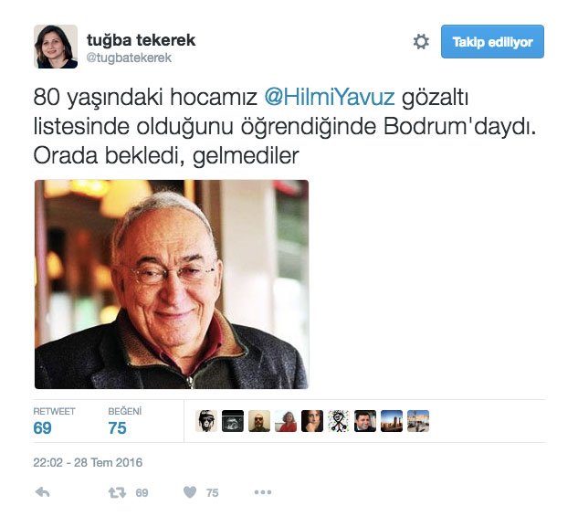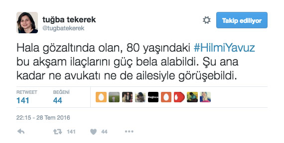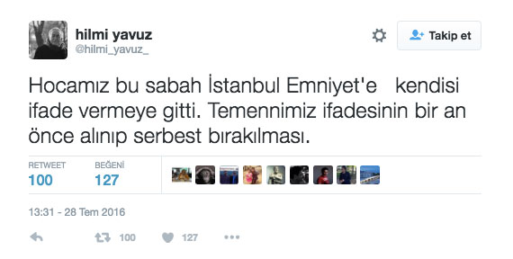 28 Temmuz sabahı, şair Hilmi Yavuz’un ifade vermeye gittiği editörü tarafından yönetilen Twitter hesabından duyuruldu.